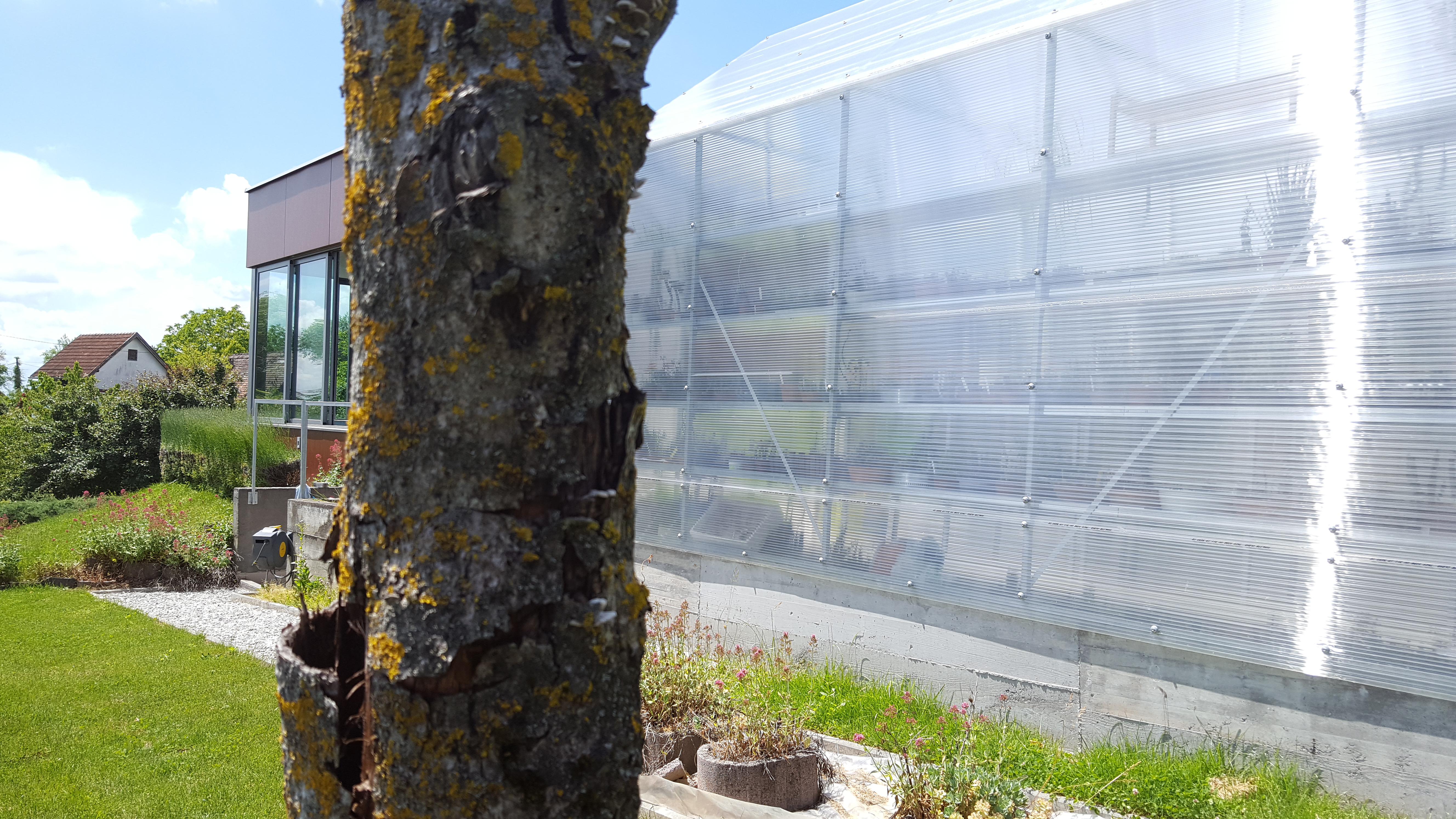 Parcela je poprilično velika, oko 4000 kvadrata i potpuno je ozelenjena. Vlasnici imaju vlastiti vrt i plastenik koji zadovoljavaju njihove potrebe za voćem i povrćem. Na ravnom krovu bazena su montirani solarni kolektori koji značajno smanjuju račune za grijanje i pripremu tople vode, što je kod kuća sa zatvorenim bazenom velika stavka. Reciklaža, uzgoj organske hrane, spremište za kišnicu i pasivna kuća je sve zapravo što jedan minimalist traži od obiteljske kuće.