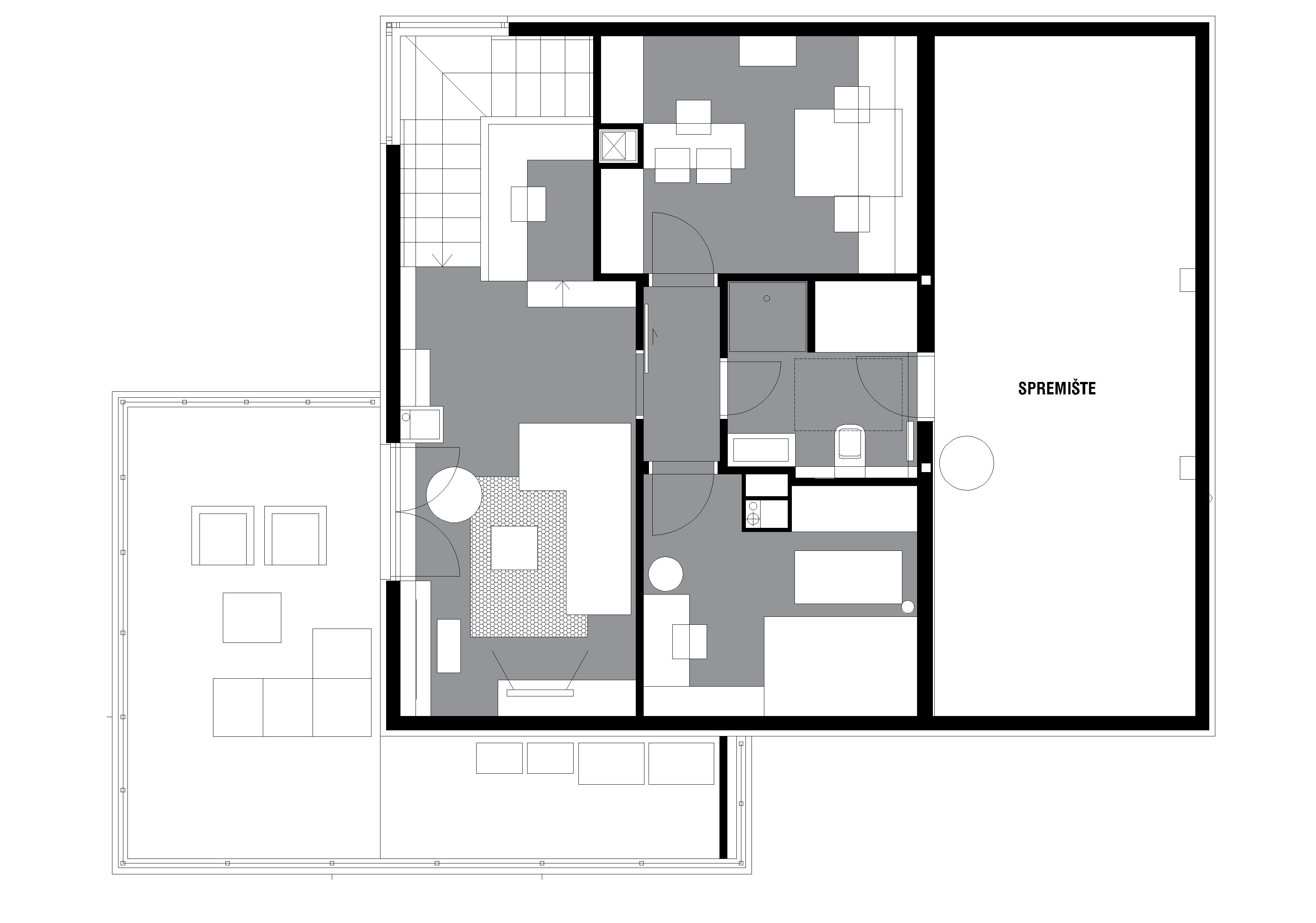 Centralni prostor stana, dnevni boravak sa kuhinjom i blagovaonicom je dobio punu visinu natrkivenu ravnim krovom, dok su se sekundarne prostorije i sobe smjestila pod kosinu.
