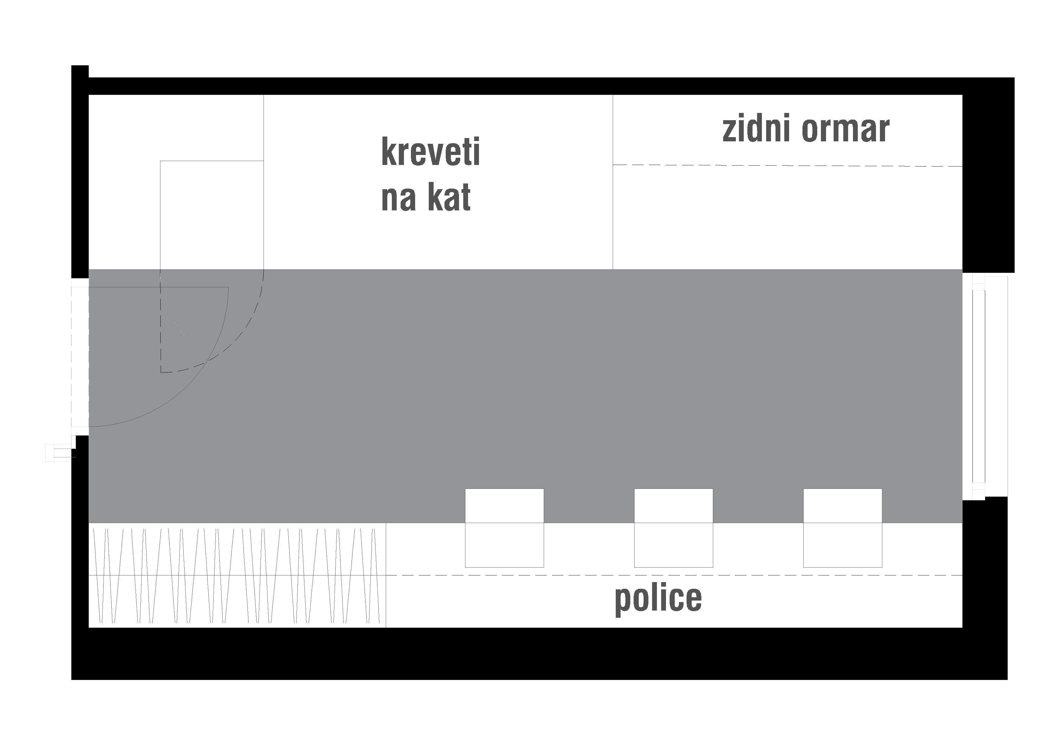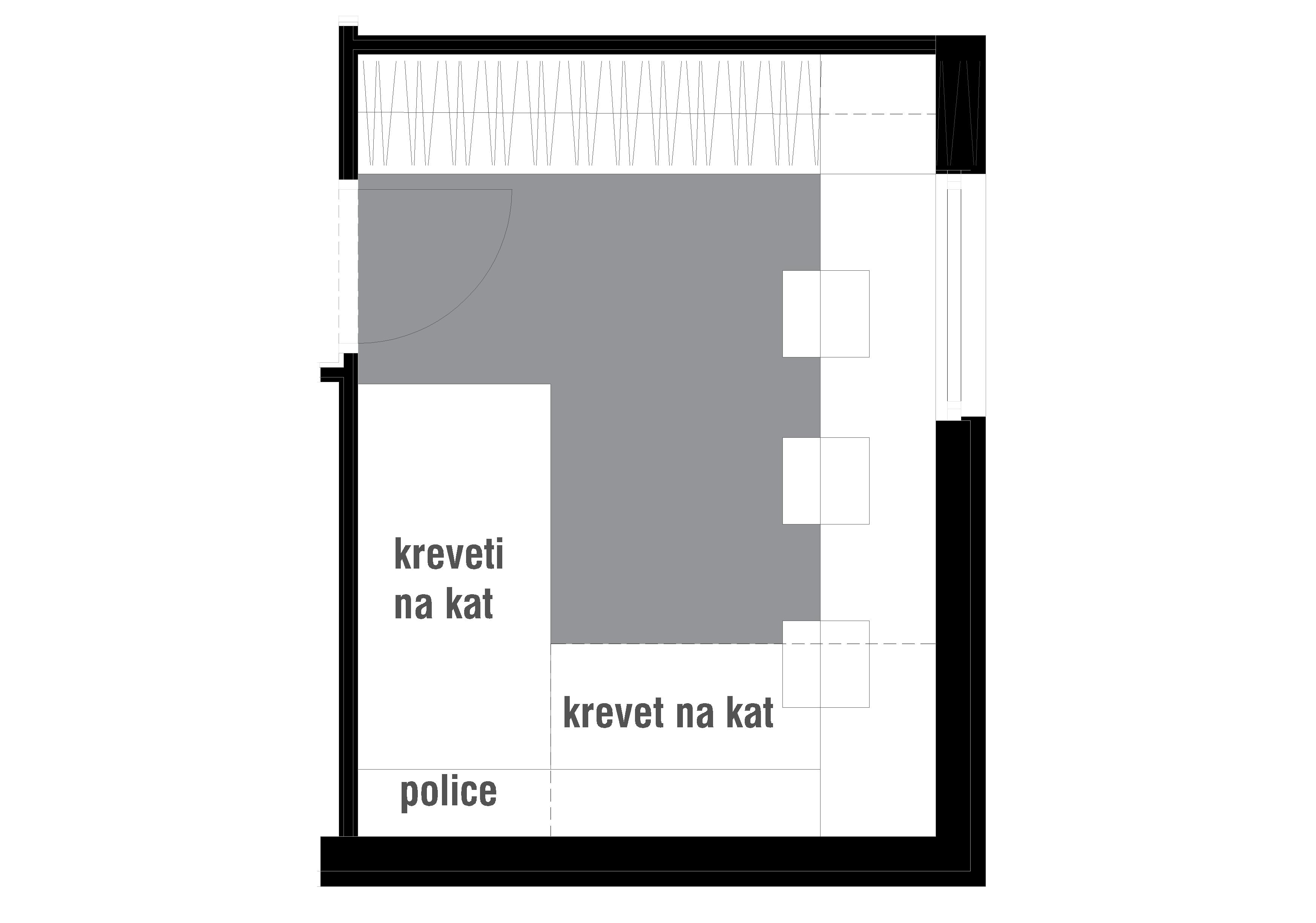 Na jedan zid se naslanjaju kreveti na kat i do njih jednostruki krevet sa prostorom za odlaganje iznad na zidu. Prostor do vrata u dubini kreveta se zatvori u multifunkcionalni ormar/garderobu/ostavu . Na suprotnom zidu je ormar za odjeću i stolovi sa policama iznad.