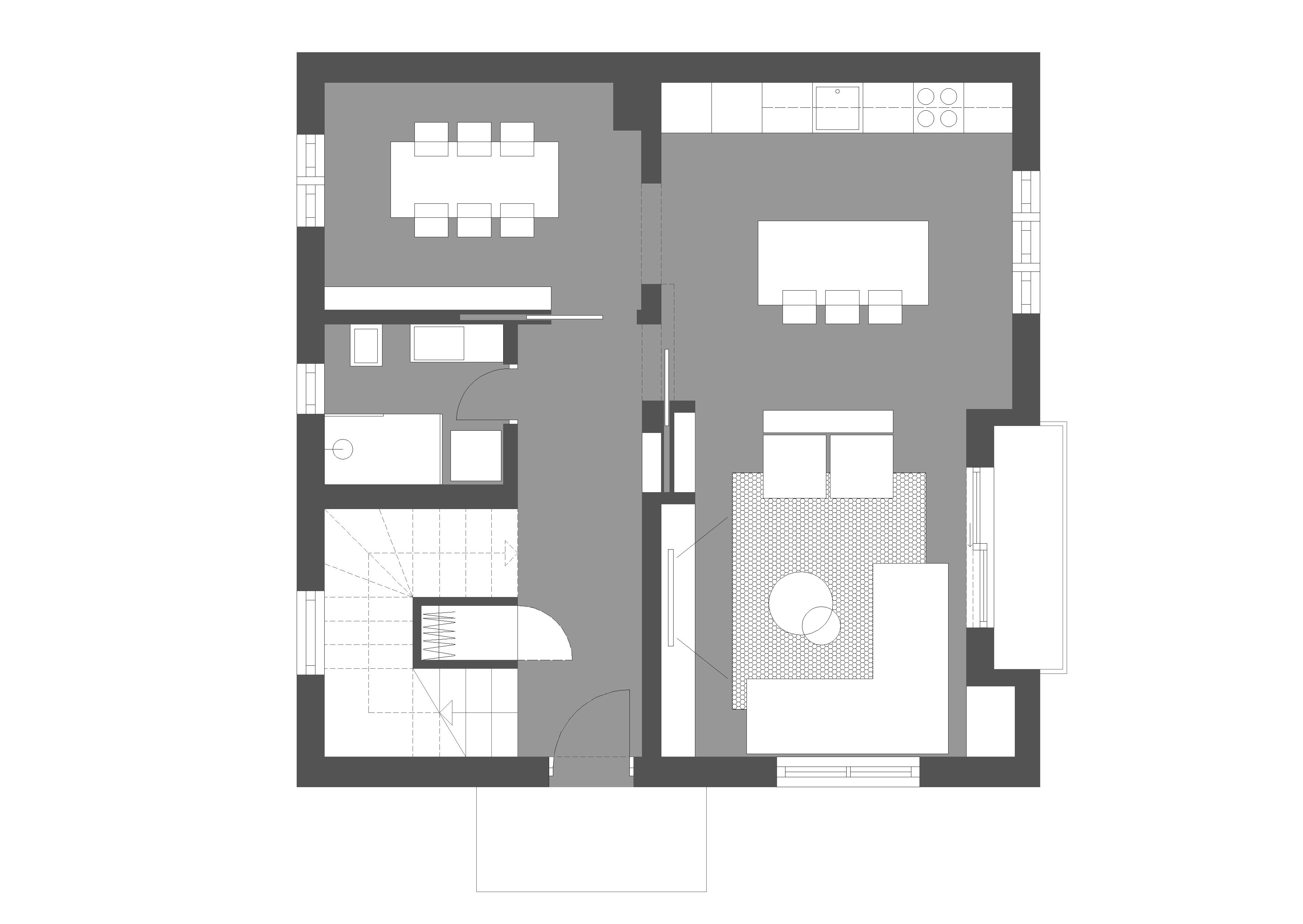 Po želji vlasnice, kuhinja i veliki otok su smješteni u zajednički prostor, dok je blagovaonica smještena u prostoru do, povezana proširenim otvorom.